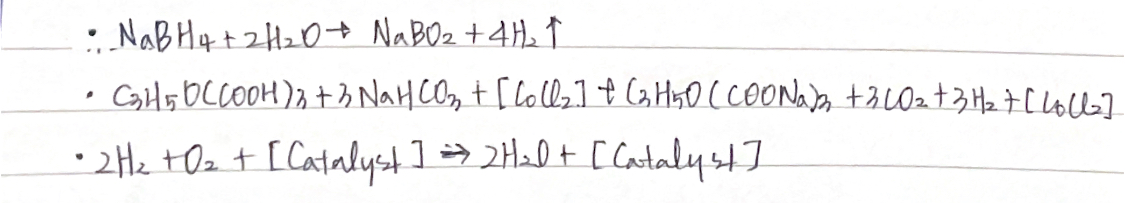 gas-pak에 NaBH4와 NaHCO3가 물과 반응해 H2와 CO2가 생성된다. 수소의 경우 산소와 반응하여 과산화수소로 전환된다.