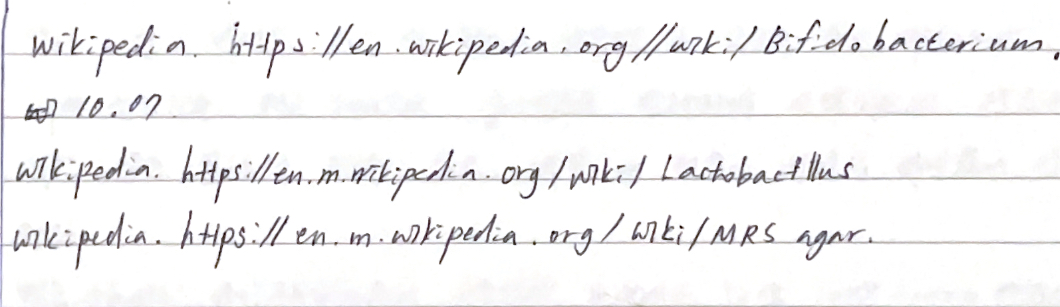 실험에서 쓰인 MRS 배지에 대하여 알아보았다. MRS 배지는 De Man, Rogosa, Sharpe agar의 약칭으로 Lactobacillus 의 배양을 위한 선택배지이다. 다른 박테리아의 성장을 억제하기 위해 sodium acetate를 포함하고 있으며 배지는 투명한 갈색을 띤다. Lactobacillus는 그람 양성, 통성혐기성 또는 미호기성의 특성을 가지며 막대 모양의 간균, 포자를 형성하지 않는 박테리아이다. Lactobacillus exhibits a mutualistic relationship with the human body, as it is the most common probiotic found in food such as yogurt, Kimch, cheese. It can help treat diarrhea, vaginal infections and skin disorders such as eczema. Bifidobacterium isa genus of gram-positive, nonmotile, often branched anaerobic bacteria. They are ubiquitous inhabitants of the gastrointestinal tract, vagina and mouth of mammals, including humans. Some Bifidobacterium are used as probiotics.