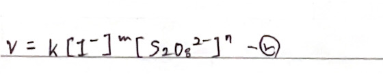 이때 반응이 시작하여 청색이 나타날 때까지 걸리는 시간은 S2O3(2-)의 양과 ㄱ)반응의 반응속도에 의하여 결정된다. 반응속도는 시간의 역수이고 따라서 I-와 S2O3(2-)의 농도를 바꾸어가며 반응속도 (청색이 나타날 때까지 걸리는 시간의 역수) 를 측정함으로서 ㄱ) 반응에 대하여 식 ㄴ)의 반응차수 m, n을 구할 수 있고 반응속도상수 K도 구할 수 있다.
