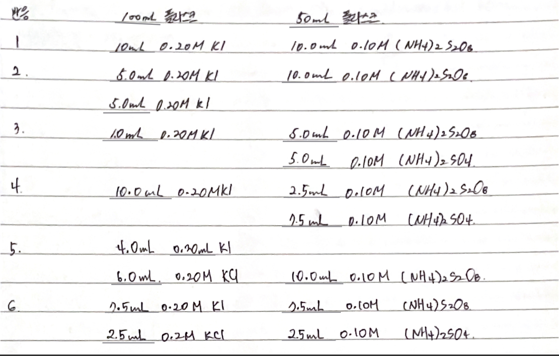 KI, KCl, (NH4)2SO8, (NH4)2SO4, 피펫, 플라스크 100ml, 50ml, 녹말 지시약, Na3S3O4, 온도계, stop watch