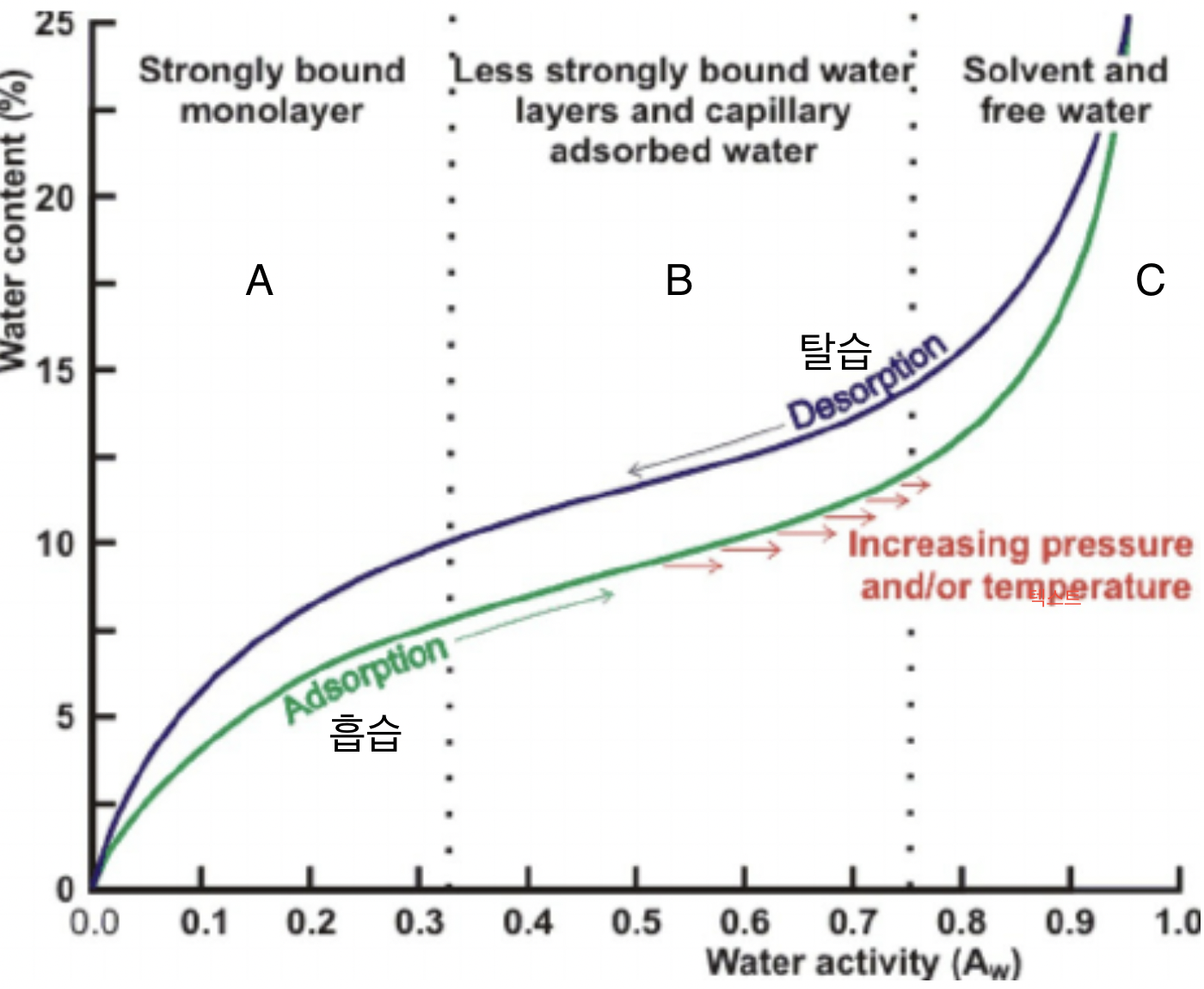 A(단분자층 영역) : 식품 수분함량 5-10%. 단분자막 형성, 식품 성분 중 carboxyl 기나 amino기와 같은 이온 그룹과 강한 이온 결합하는 영역으로 물 분자가 결합수로 존재, 광선 조사에 의한 지방질 산패 심함.