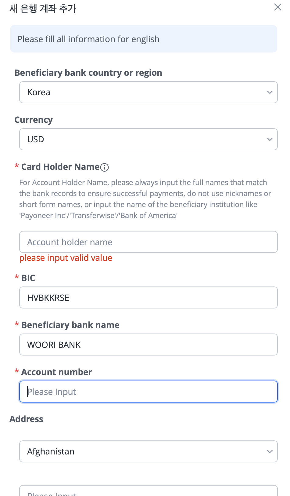 - 은행명 (영문으로 작성)을 작성해주셔야 합니다. 줄임말이 아닌 풀네임으로 작성하셔야 합니다.